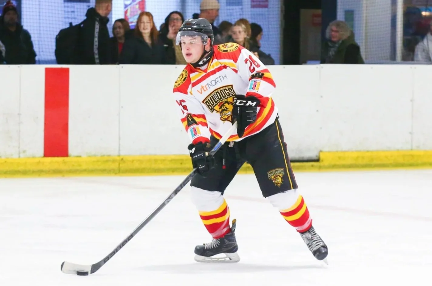 ON THE BOARD: Kacper Andrukianiec scored the Bulldogs’ second goal at Ice Sheffield. Picture: Andy Bourke/Podium Pictures